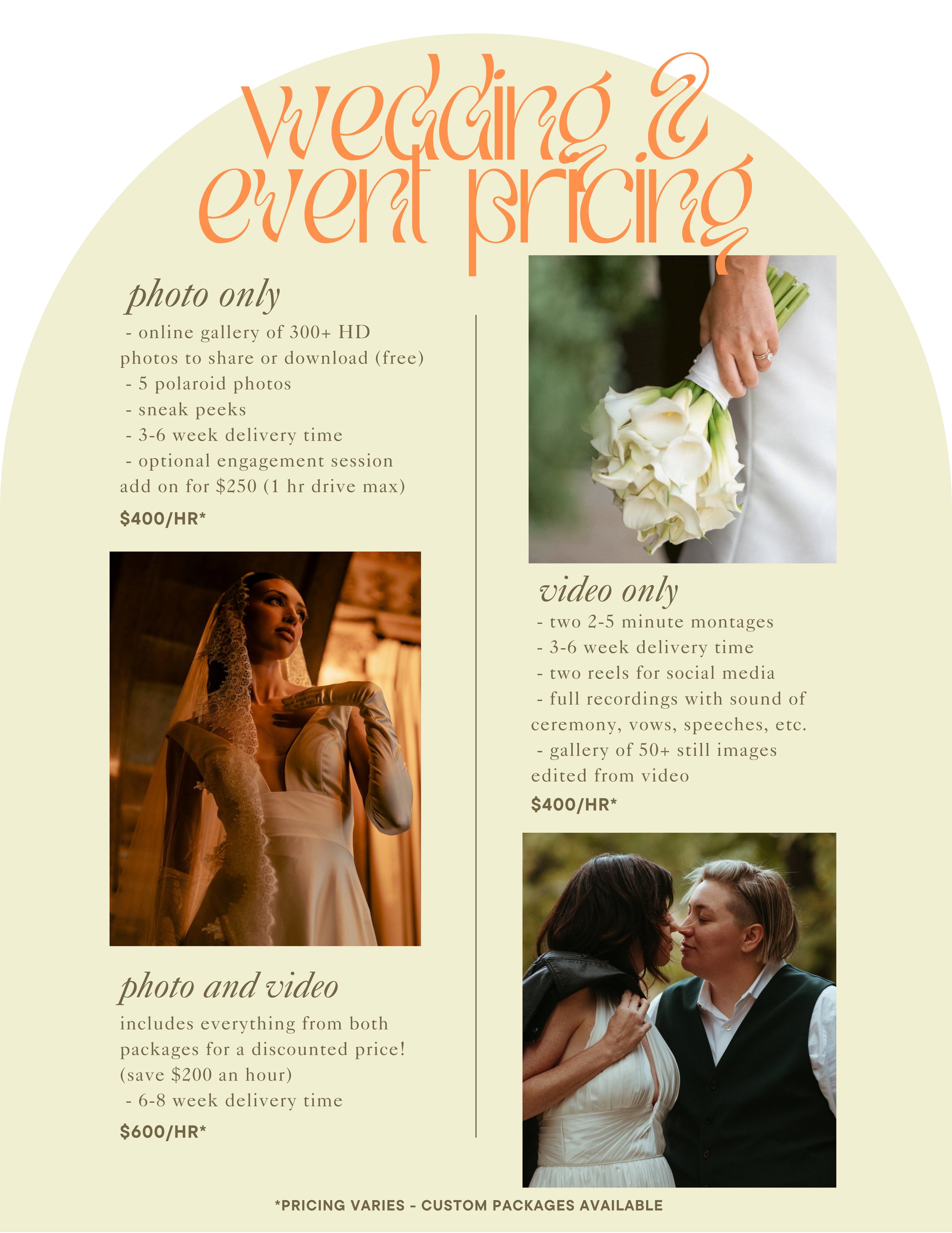 Below is a series of questions and fill-in-the-blanks that will help me get the information I need to be your photo/videographer. I don’t offer packages or require much from you as the client, I try to make booking a stress-free process. I simply have an hourly rate and offer no-interest payment plan options :) Send me a message and let’s see if we’re a good fit!